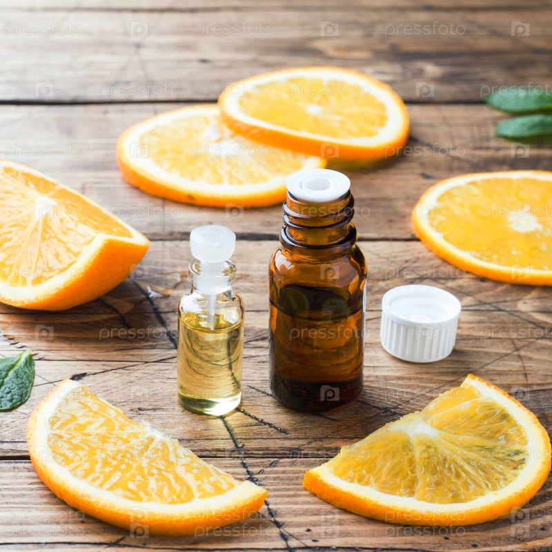 Эфирное апельсиновое масло в бутылке, ломтики свежих фруктов на деревянном фоне. Натуральные ароматизаторы