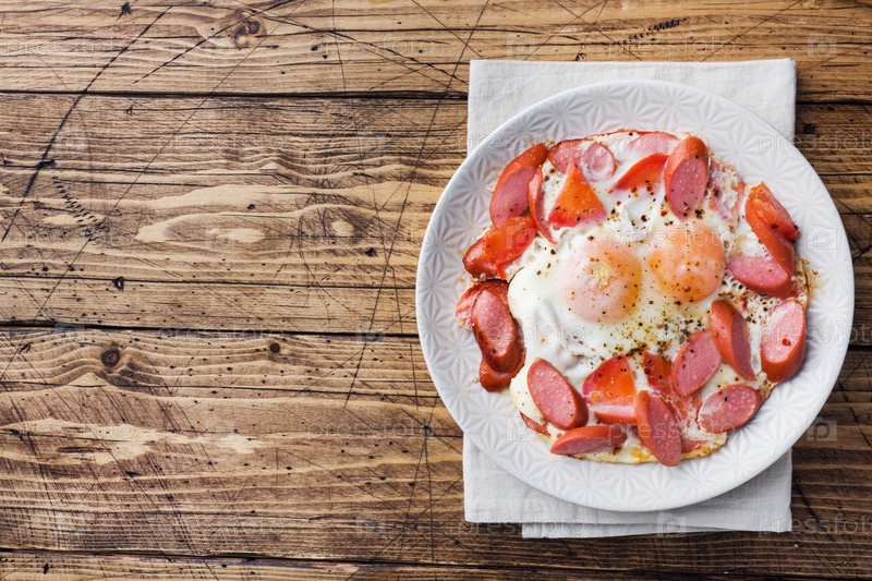 Жареные яйца, сосиски и помидоры на тарелке на столе. Богатый домашний завтрак. Деревянный фон. Скопируйте пространство