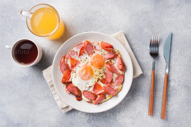 Жареные яйца, сосиски и помидоры на тарелке на столе. Богатый домашний завтрак. Серый бетонный фон. Скопируйте пространство