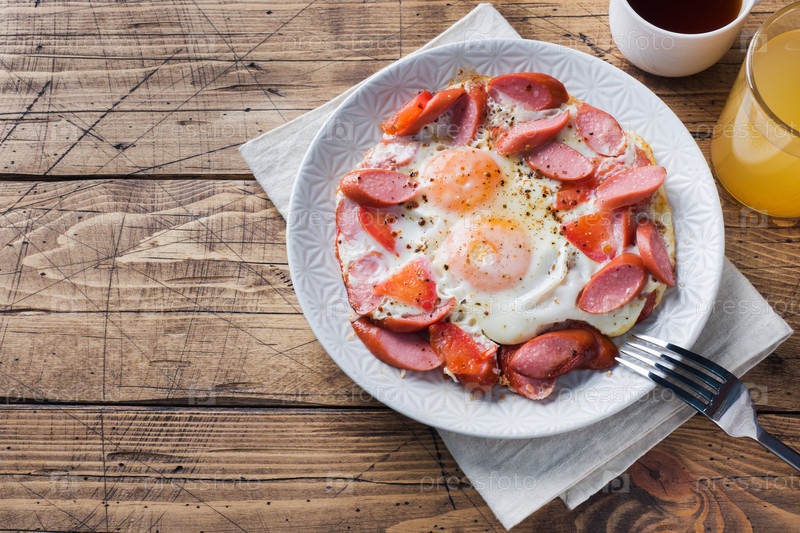 Жареные яйца, сосиски и помидоры на тарелке на столе. Богатый домашний завтрак. Деревянный фон. Скопируйте пространство