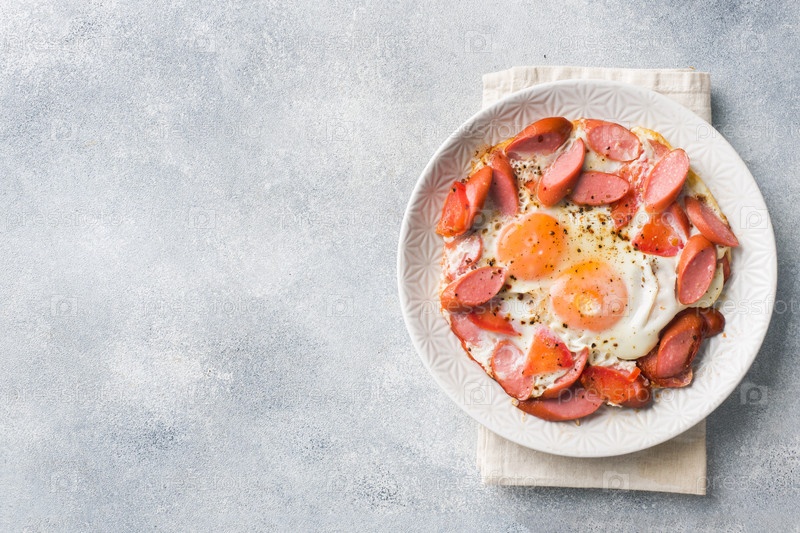 Жареные яйца, сосиски и помидоры на тарелке на столе. Богатый домашний завтрак. Серый бетонный фон. Скопируйте пространство