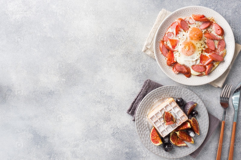 Блюда для домашнего приготовления сытного завтрака. Яичница с сосисками и помидорами. Бельгийские рифленые вафли с инжиром и виноградом. Серый бетонный фон для копирования