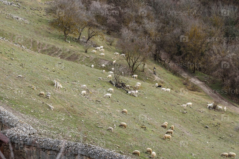 Стадо коз и овец пасется на склоне под пещерным городом Чуфут-Кале в Бахчисарае, Крым