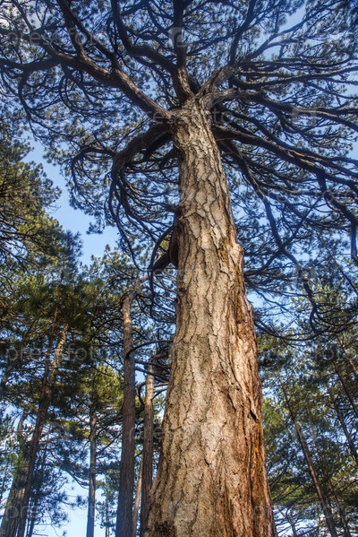 Вид на вершину сосны в лесу с земли. Крым