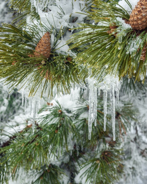 Заснеженные ветки сосен с шишками и сосульками на горе Ай-Петри весной. Крым