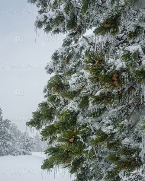 Заснеженные ветки сосны на горе Ай-Петри весной. Крым