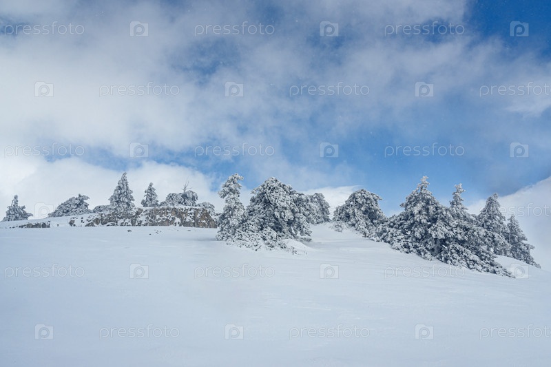 Заснеженный лес на вершине горы Ай-Петри после метели. Крым