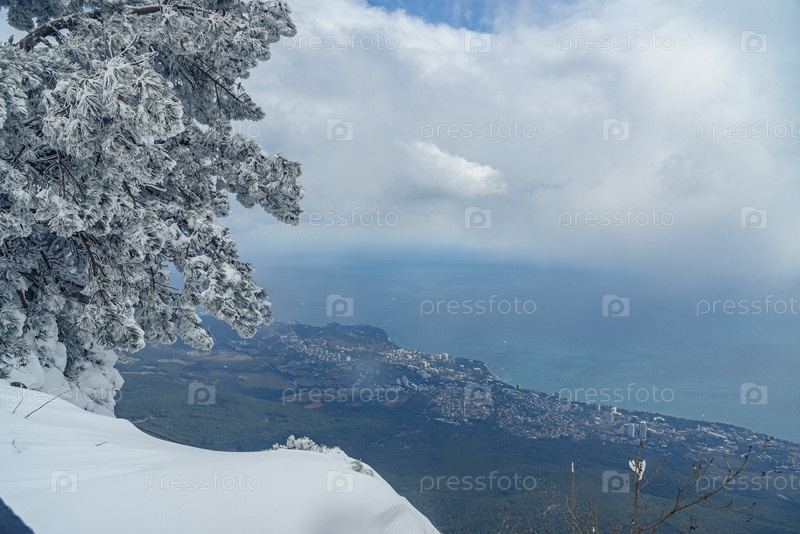 Живописный вид на город Ялту и Черное море покрыло снежную вершину горы Ай Петри в Крыму весной