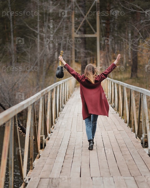 Молодая счастливая женщина гуляет с гитарой укулеле по мосту в осеннем лесу