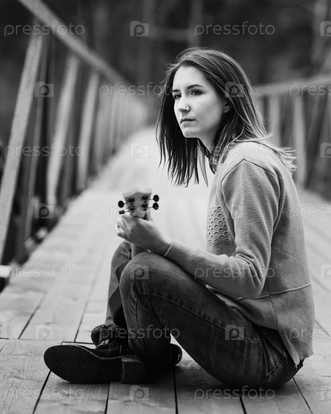 Молодая женщина сидит и играет на гитаре укулеле на мосту в осеннем лесу