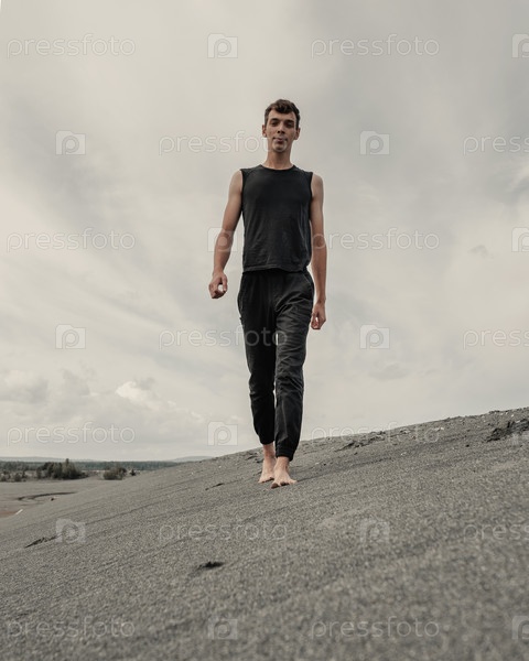 Молодой человек ходит один по песку в песчаной пустыне