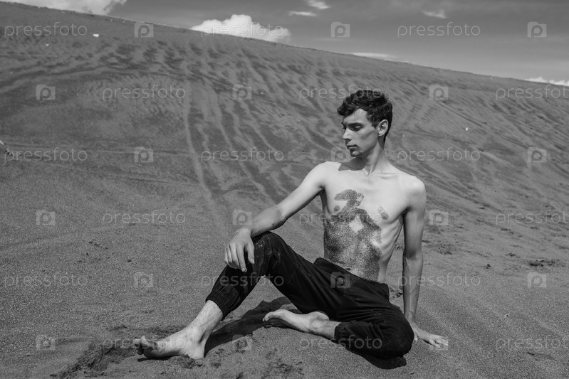 Человек сидит на песке в песчаной пустыне. Черное и белое