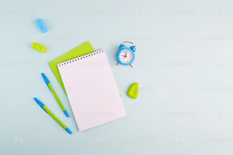 Школьные принадлежности на голубом фоне. Блокнот, ручки, будильник и резинки