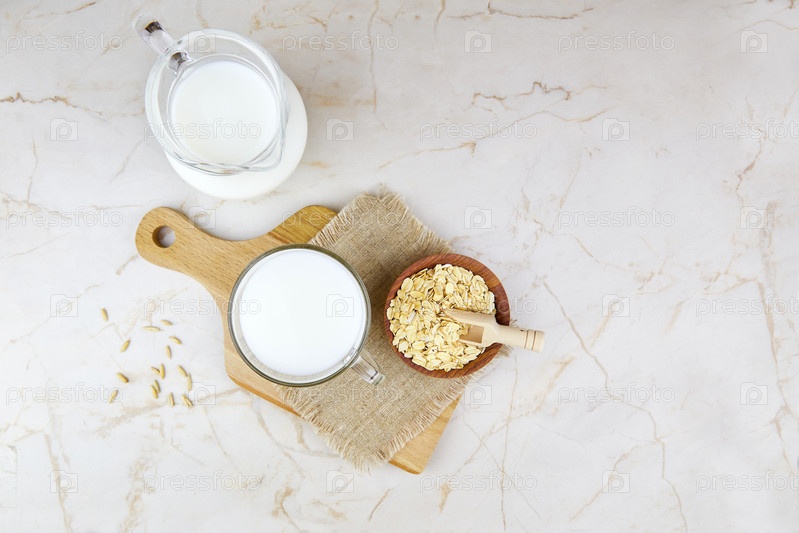 Овсяное молоко в стакане и кувшине, овсянка в миске на льняной салфетке