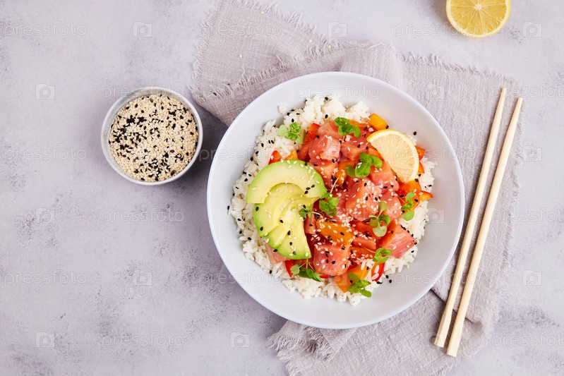 Поке боул с лососем или тунцом, рисом, авокадо, кунжутом, микро зеленью. Гавайская диетическая еда с рыбой, покебоул