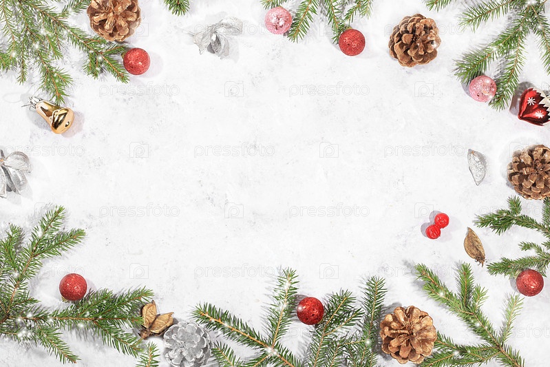 Рождественский макет для дизайна и демонстрации продукта, рождественская композиция и концепция нового 2023 года, красивые праздничные украшения на светлом фоне, открытка, баннер зимнего экрана с местом для текста, выборочный фокус
