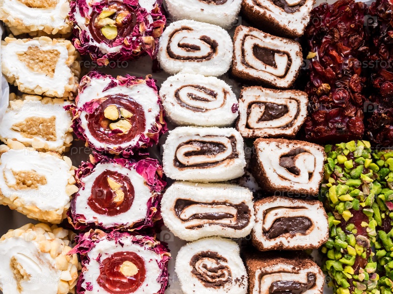 Рахат-лукум с орехами, фисташками, кокосом, шоколадом и листьями розы. Рахат лукум, традиционные турецкие сладости, Турция
