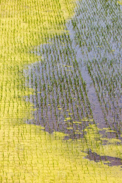Часть азиатских зеленых рисовых полей. Изображение крупным планом. Вид сверху на рисовые поля, Южная Корея