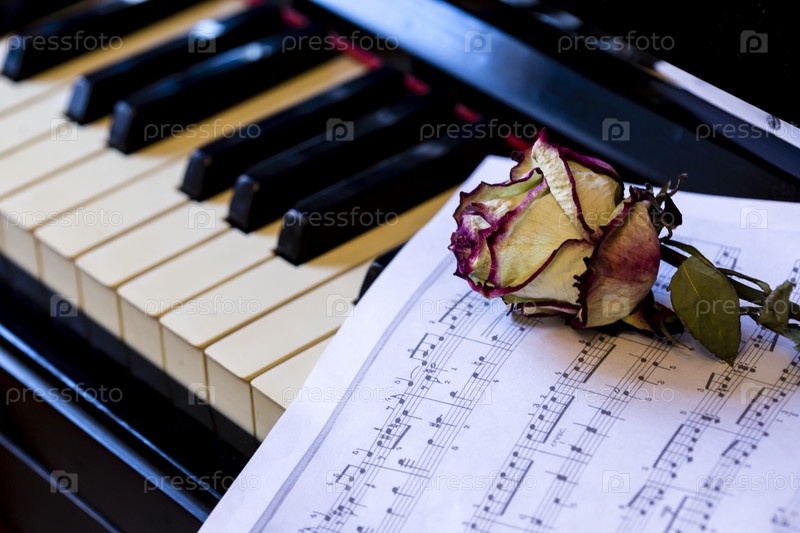 Клавиши фортепиано с сухой розой. Идея концепции для любви к музыке, для композитора, музыкального вдохновения