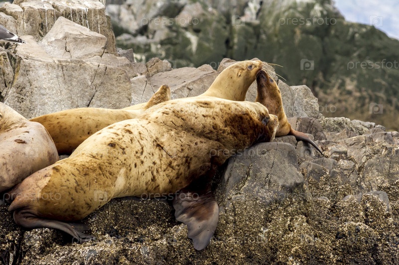 Колония морских львов (Eumetopias jubatus) на скале, Россия, Камчатка, возле мыса Кекурный, Русская бухта