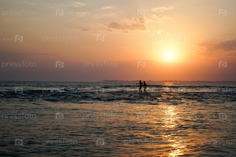 Морской пейзаж с силуэтами людей на закате