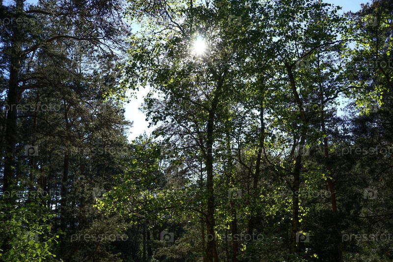 Яркое солнце, просачивающееся сквозь листву деревьев в лесу