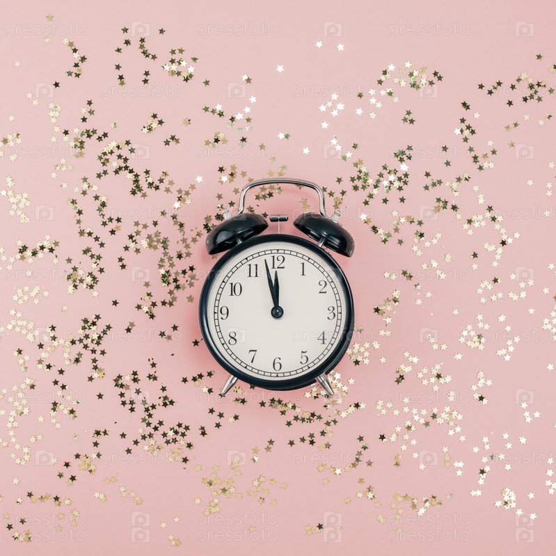 Концепция Нового года. Будильник с золотым конфетти