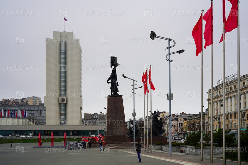Городской пейзаж с видом на центральную площадь с красными флагами