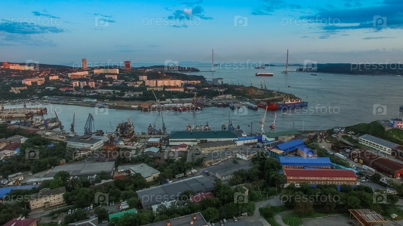 Владивосток, Россия-31 августа 2019 г.: Вид с воздуха на городской пейзаж на закате