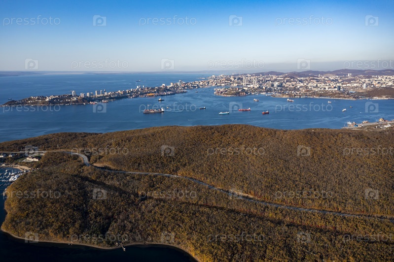 Вид с воздуха на остров Русский и Владивосток, Россия