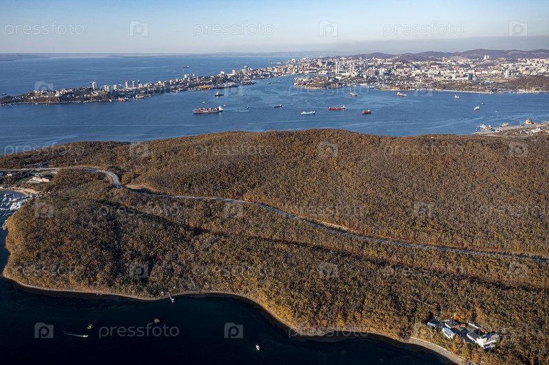 Вид с воздуха на остров Русский и Владивосток, Россия