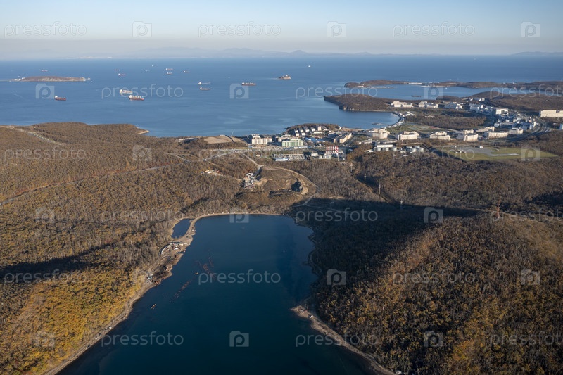Вид с воздуха на морской пейзаж с видом на остров Русский