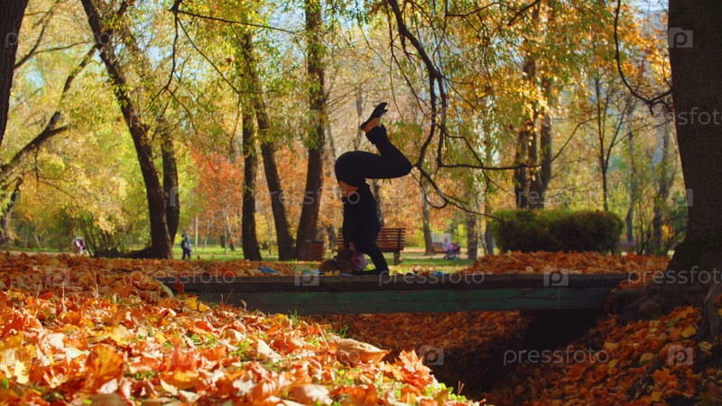 Молодая привлекательная женщина занимается йогой в парке