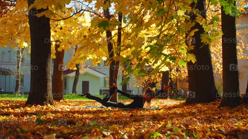 Молодая привлекательная женщина занимается йогой в парке