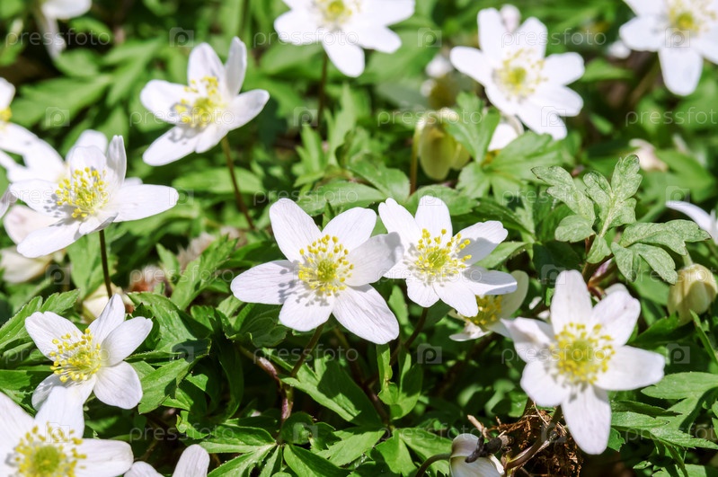 Весенний лес. Лесная ветрянка Anemone sylvestris. Белые цветы на лесной поляне