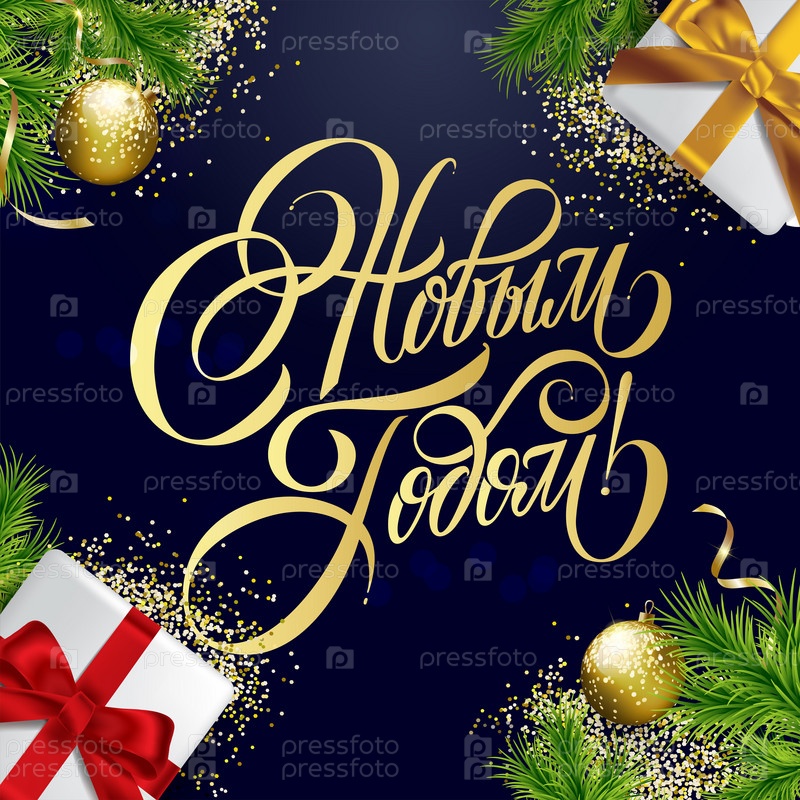Векторный текст. С Новым годом - русский праздник. С Новым годом рукописные надписи, типографский векторный дизайн для поздравительных открыток и плакатов. Русский перевод: С Новым годом
