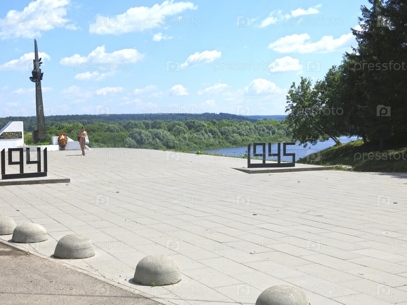 Набережная реки Оки в городе Таруса с памятником погибшим в войне