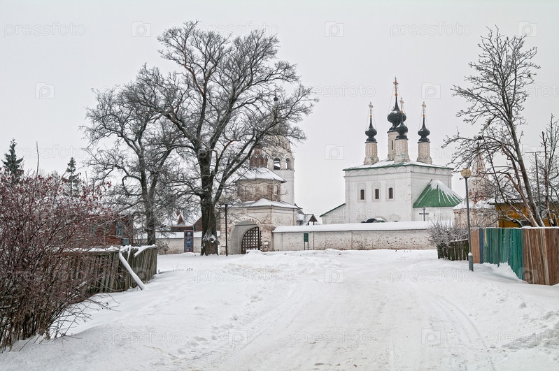Улица, ведущая к Александровскому мужскому монастырю. Суздаль, Россия. Облачный день в декабре