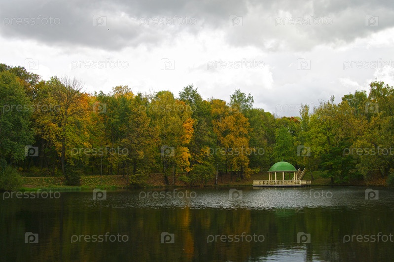 Павильон на поверхности пруда. Пасмурный день в начале октября. Усадьба Узкое, Москва. (Павильнон использовался при съемках фильма "Утомленные солнцем - 2". В настоящее время разобран полностью.)