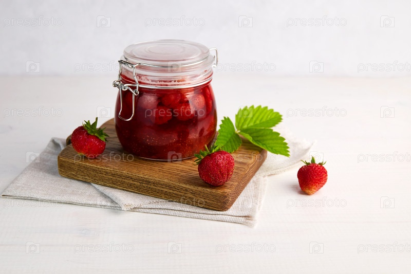 Клубничное варенье в стеклянной банке со свежими ягодами на белом деревянном фоне. Домашний клубничный мармелад
