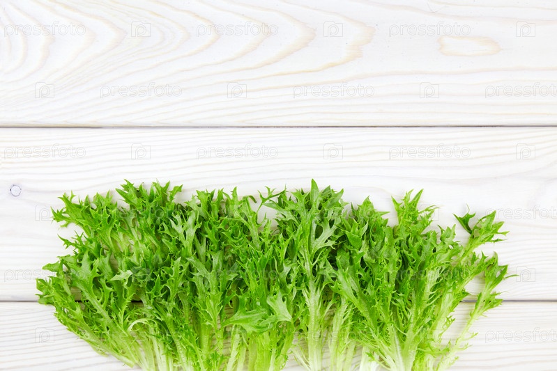 Куча сырого органического зеленого салата фризе на белом деревянном фоне. Закрыть. Вид сверху