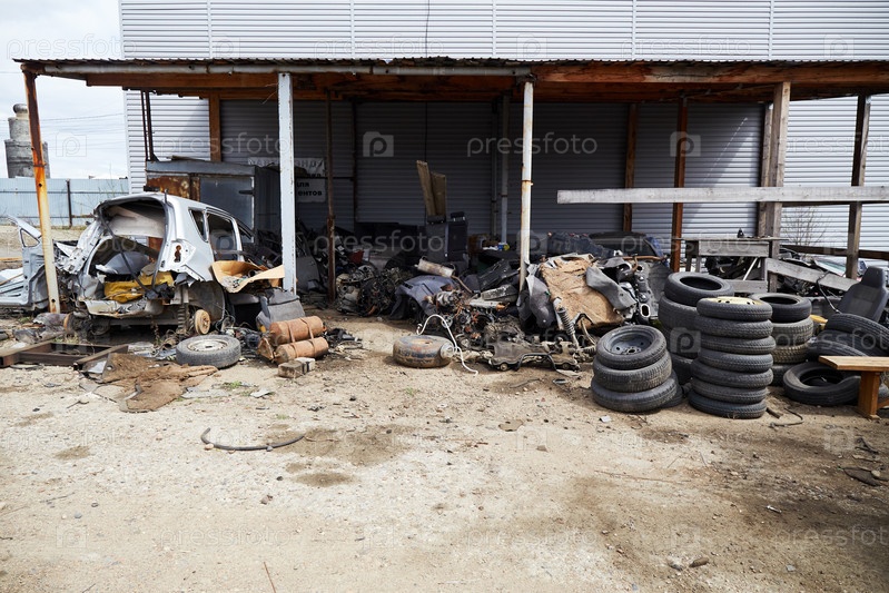 Старые подержанные автомобильные шины, сломанные разобранные автомобили на свалке