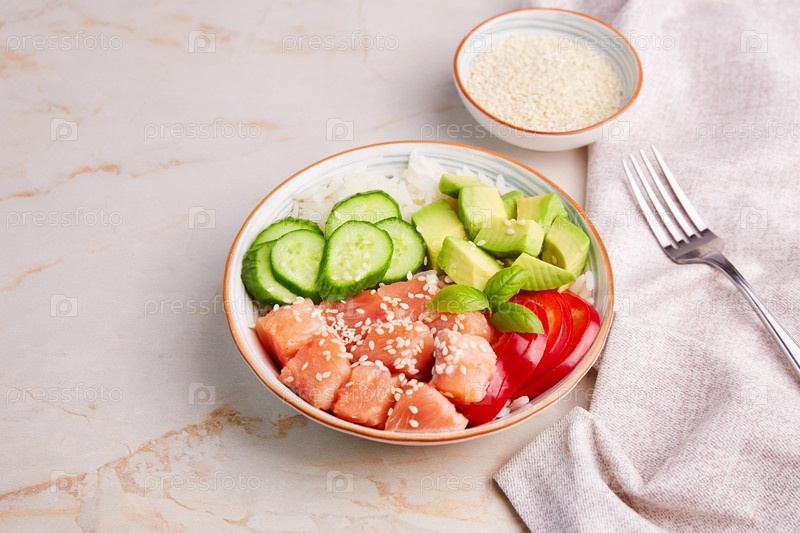 Чаша с лососем, рисом, авокадо, огурцом, перцем и семенами кунжута. Гавайский ахи, диетическое блюдо с рыбой