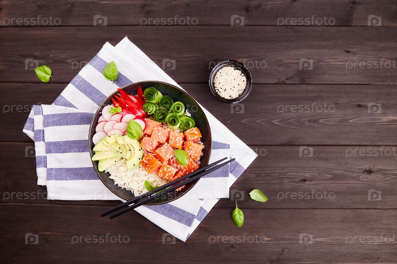 Поке боул с лососем, тунцом, рисом, авокадо, огурцом, редисом, перцем