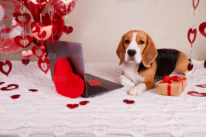 Собака бигль лежит на кровати, рядом с подарком с красной лентой и ноутбуком с кредитной картой