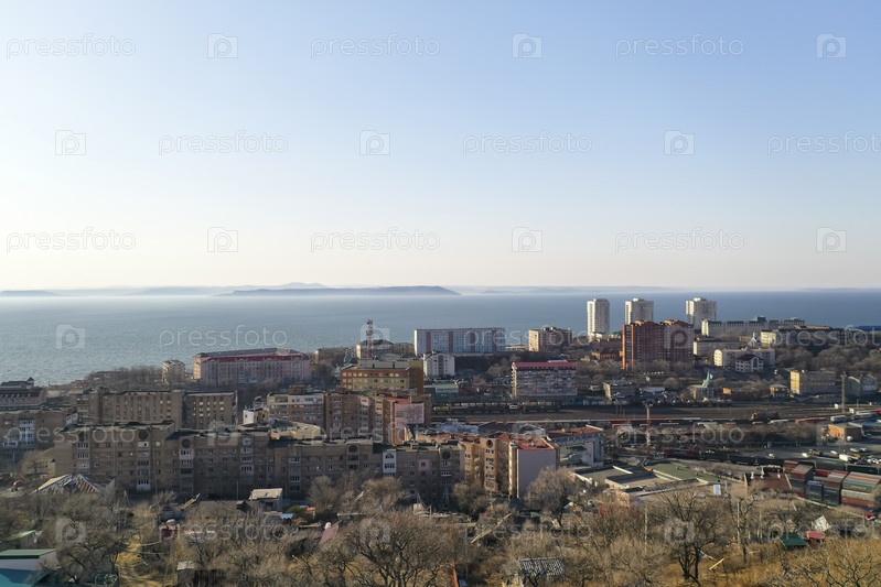Владивосток, Россия. Городской пейзаж на фоне голубого неба
