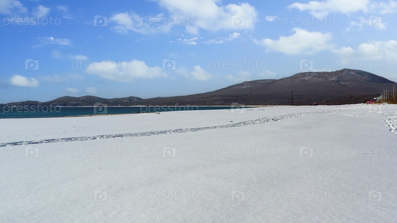 Морской пейзаж с видом на пляж в снегу