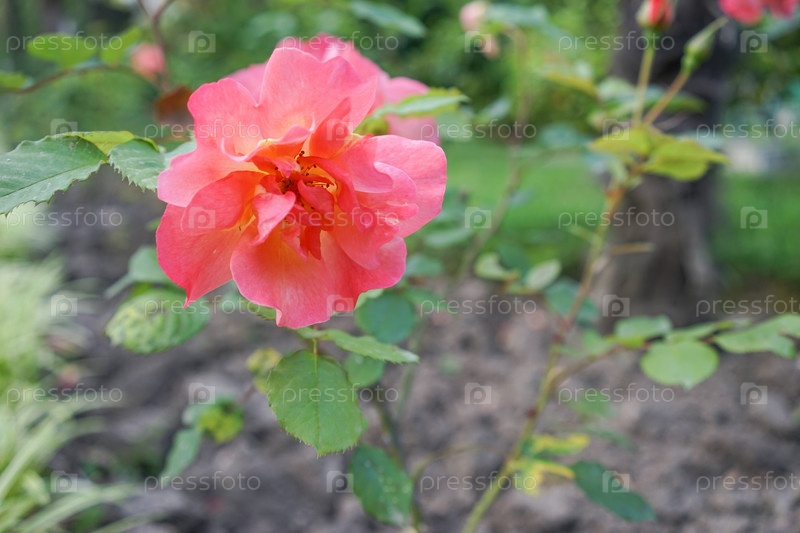 Цветочная пышная оранжевая роза на размытом зеленом фоне