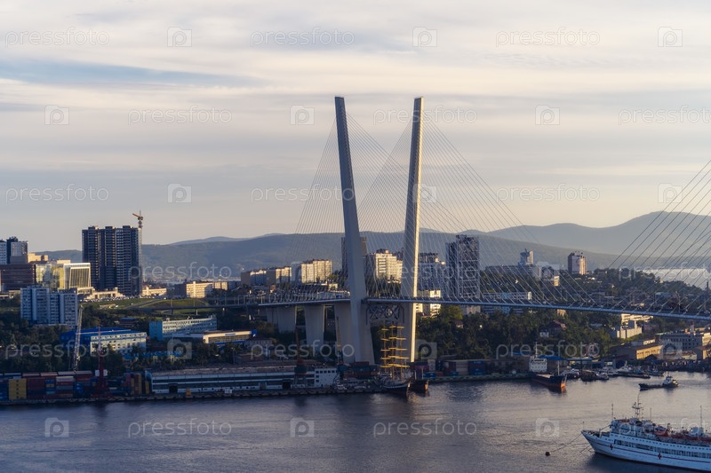 Городской пейзаж с видом на Золотой мост. Владивосток, Россия