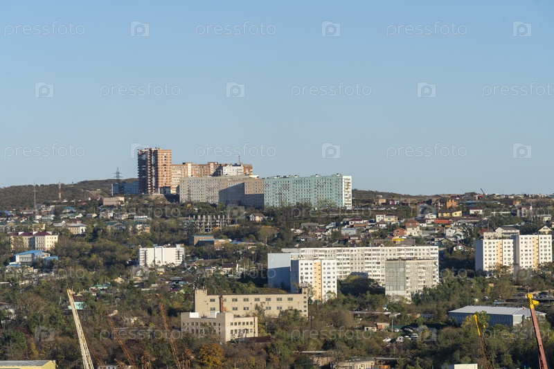 Владивосток, Россия. Городской пейзаж на фоне голубого неба